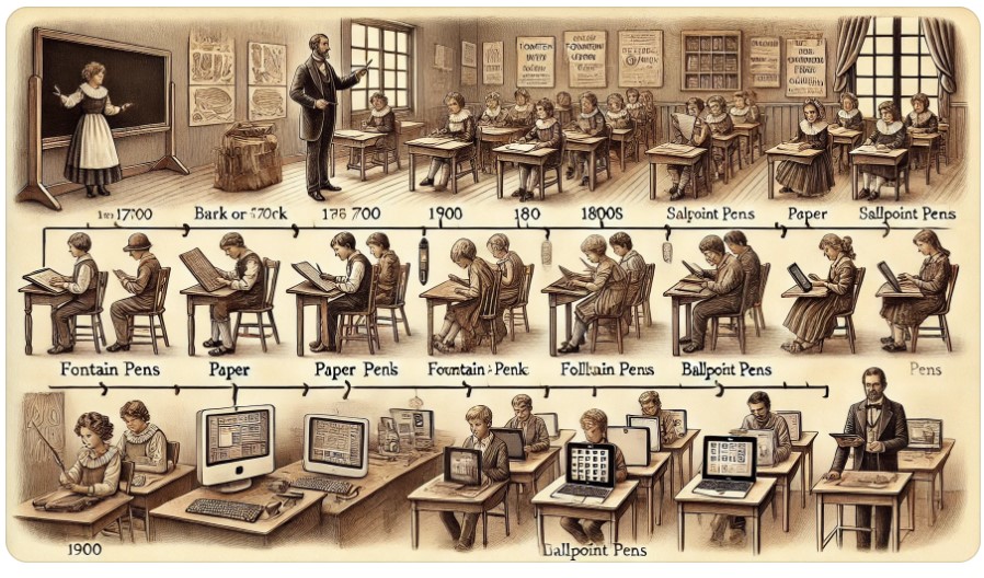 - Eszközök: Minden korszakhoz kapcsolódóan bemutathatók az adott idézetekben említett eszközök, például a fakéreglap, a palatábla, a papír, a tinta, a töltőtoll, a golyóstoll, a kézi számológép, és végül a modern okoseszközök.